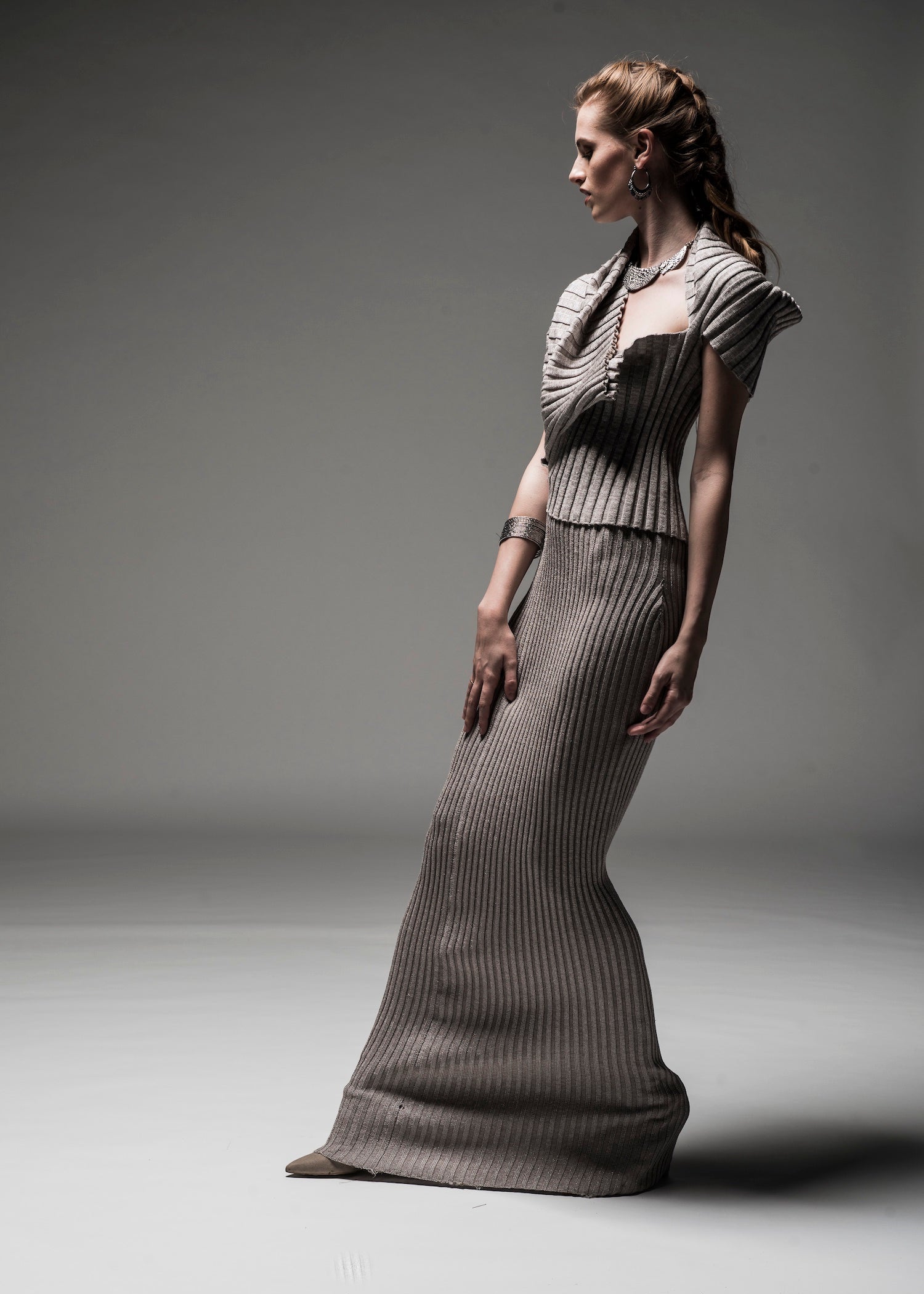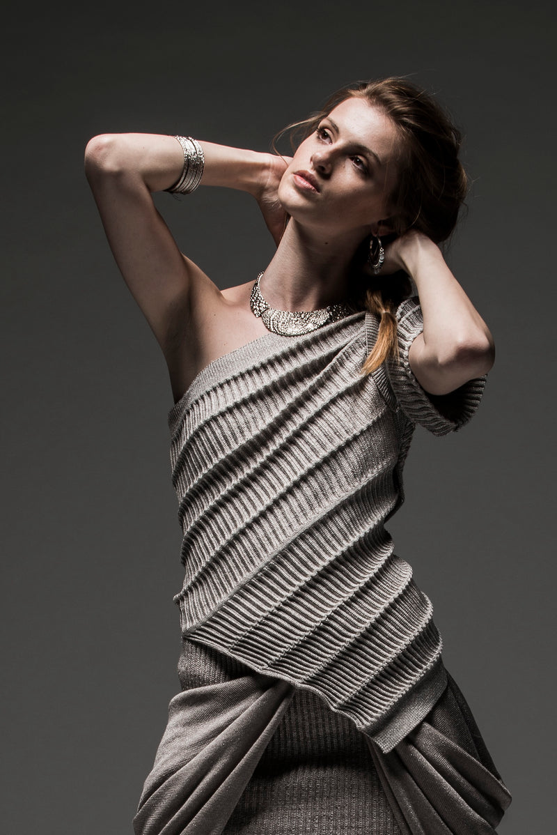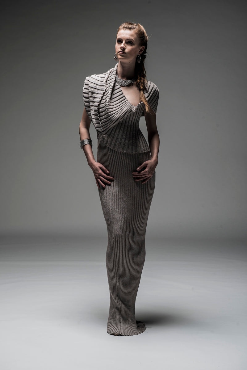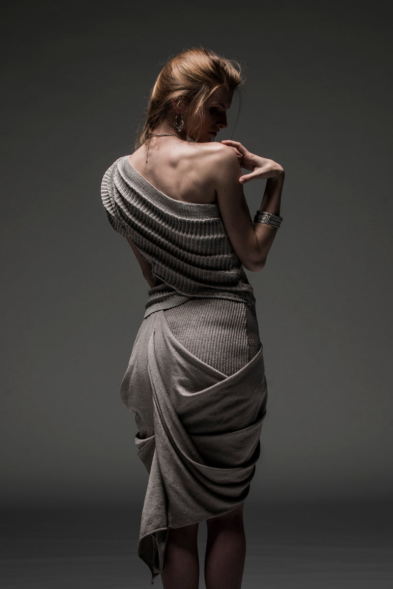 This project was started over a decade ago, inspired by the reverence of the divine feminine by the ancient Greek and Roman sculptors. Anne wanted to create knitwear designs that mimicked the texture and draping in the sculptures through different patterns of ribs but also retained the reverence for the divine. She designed stitches, knitted the fabric and made every piece with an inspired heart.