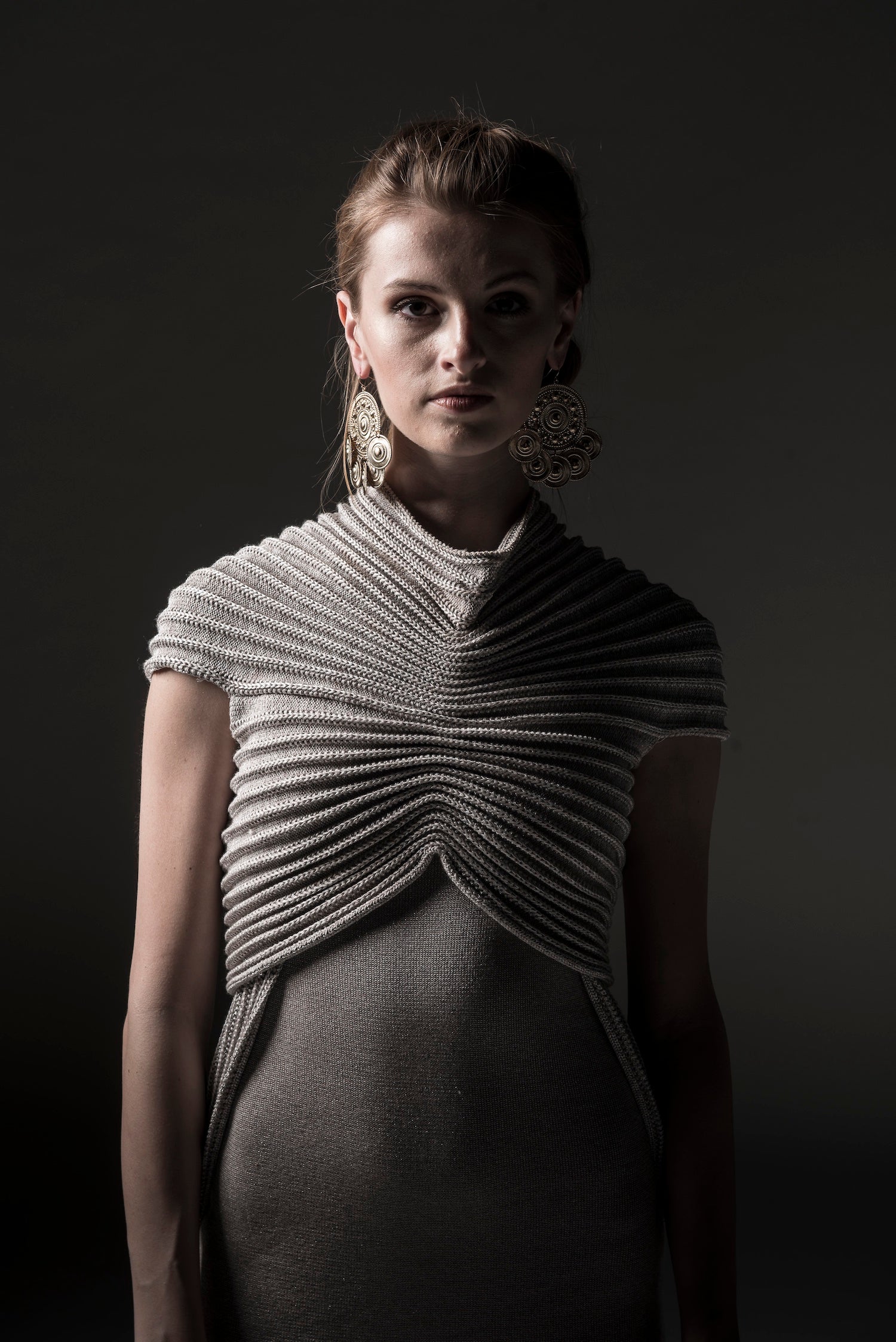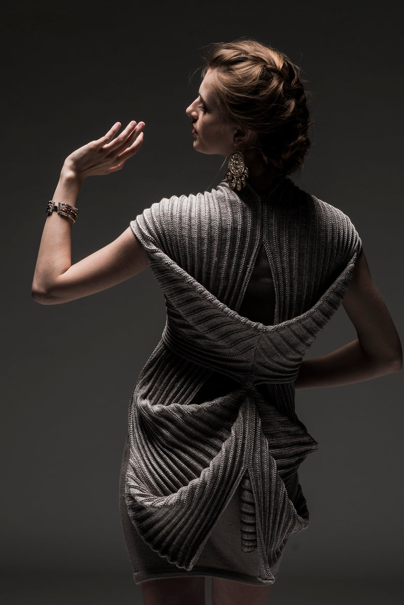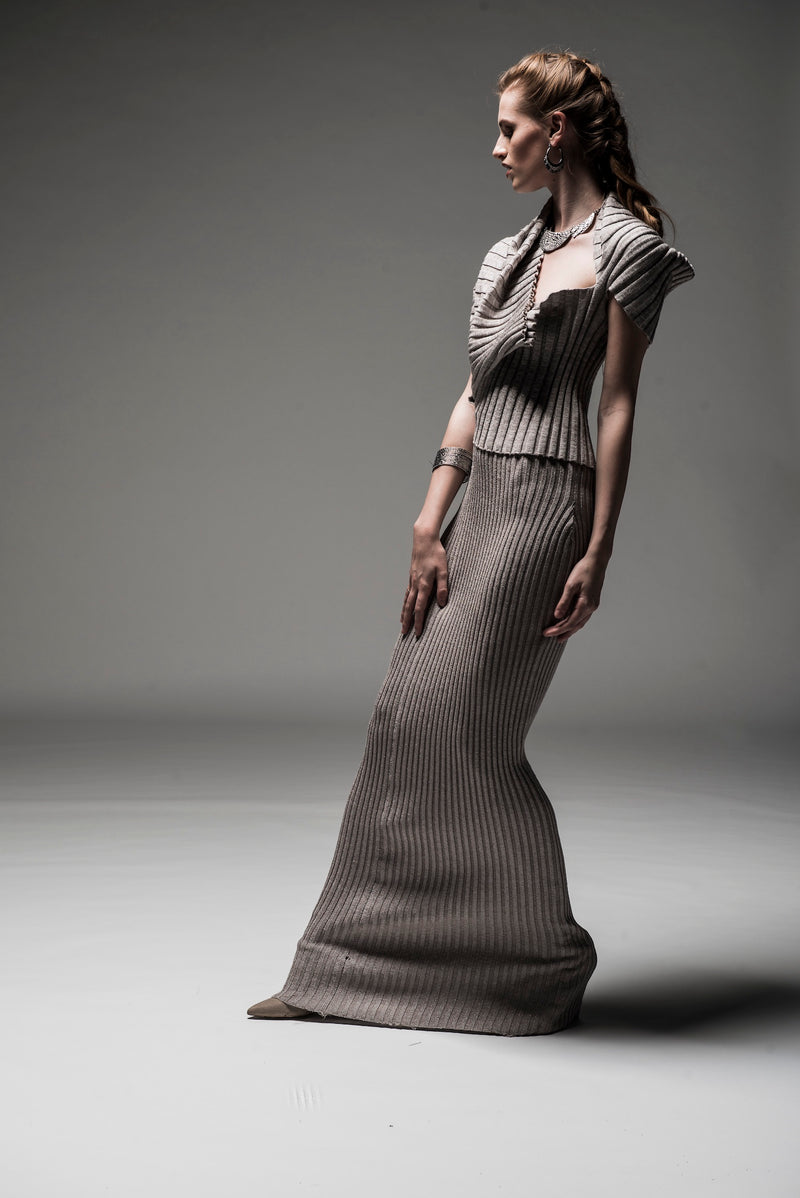This project was started over a decade ago, inspired by the reverence of the divine feminine by the ancient Greek and Roman sculptors. Anne wanted to create knitwear designs that mimicked the texture and draping in the sculptures through different patterns of ribs but also retained the reverence for the divine. She designed stitches, knitted the fabric and made every piece with an inspired heart.