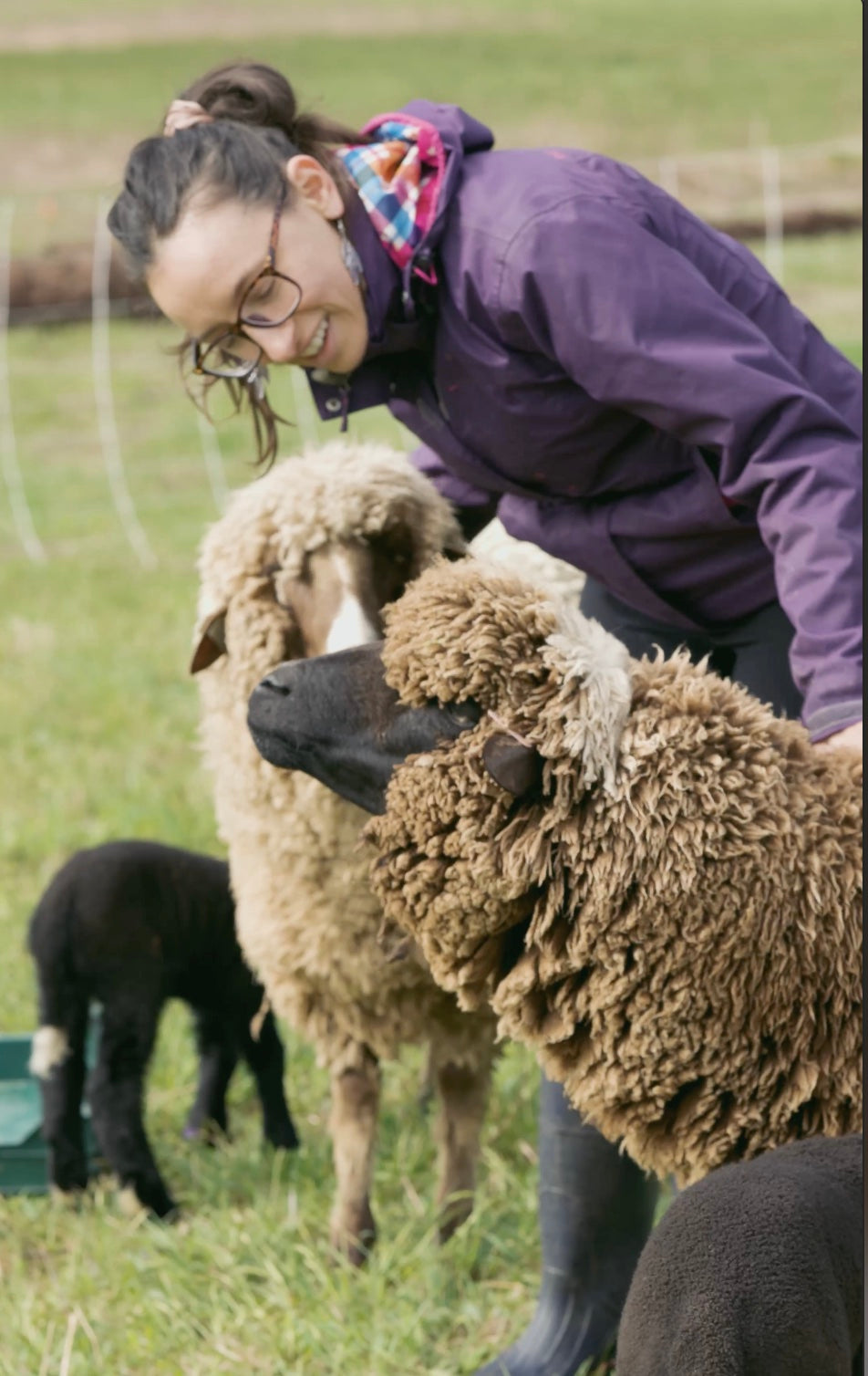 Anne’s creations inspired David to find and raise a fine wool breed, so that all future creations are of the highest possible vibration. Imbued with love and light at every step—from stewardship of the soil and animals, to hand shearing and processing fleeces into yarn, to knitting and dyeing—these garments will be truly unique and one of a kind, resonating with the cosmic throws of divine harmony.
